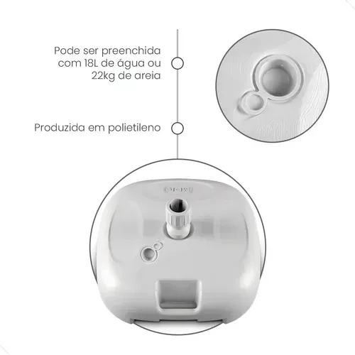 - A flexibilidade de preenchimento com água (18L) ou areia (22kg) e o encaixe ajustável para hastes de 19mm a 36mm asseguram compatibilidade universal e uma estabilidade personalizada para diversas condições.