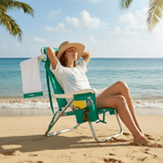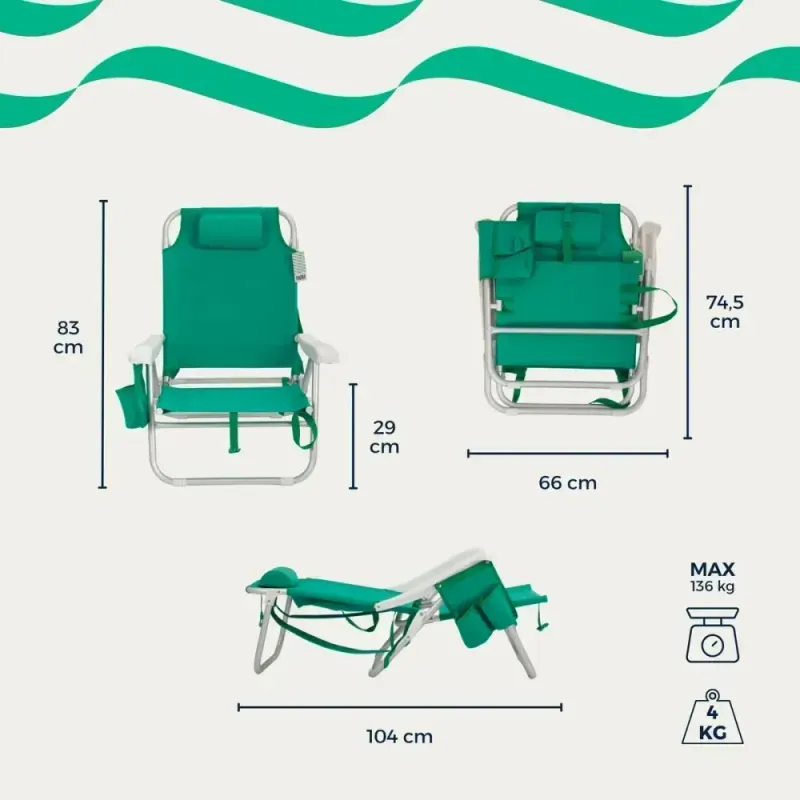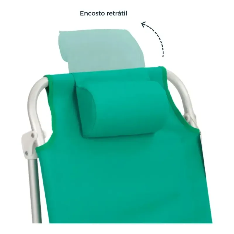 | Funcionalidade | Cadeira de praia dobrável, reclinável em 5 posições (até 180°), com função espreguiçadeira |