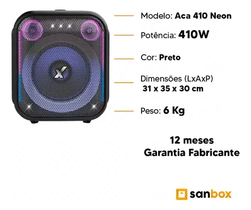 - Função TWS (True Wireless Stereo): Permite conectar duas caixas ACA410 sem fios, dobrando a potência sonora.