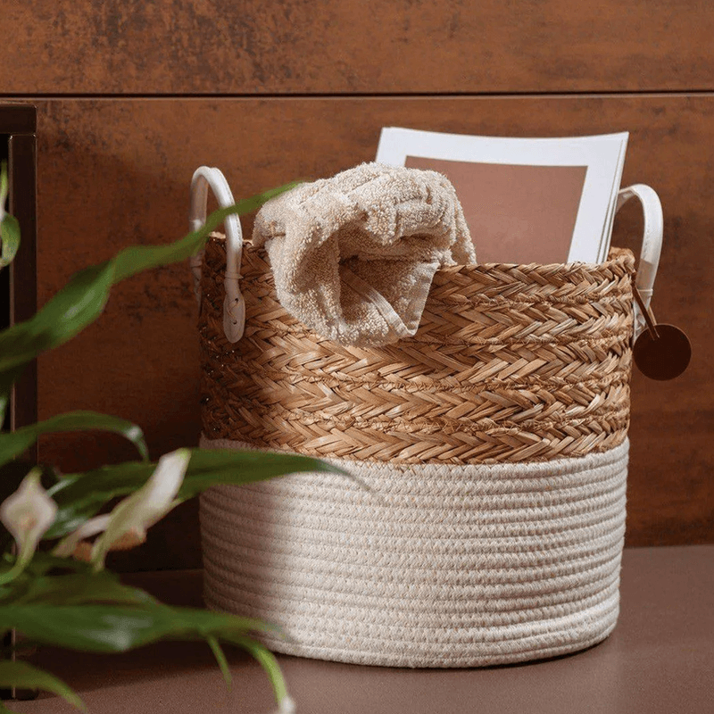 fibra natural Seagrass e corda de algodão, esse cesto traz um toque rústico, elegante e sustentável ao ambiente. Seu formato redondo e estrutura flexível facilitam o manuseio e a adaptação em diferentes espaços, como salas, quartos, banheiros e escritórios. Um item decorativo e funcional para quem valoriza organização com estilo.