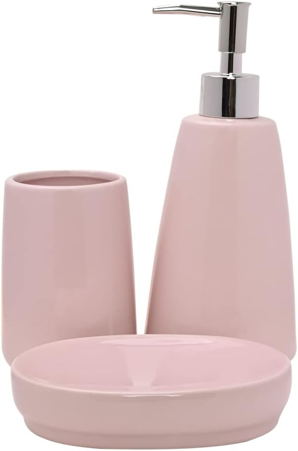 Com toque delicado e visual romântico, o Conjunto Pale Softpink da Mimo Style transforma seu lavabo. Produzido em cerâmica de alta qualidade na cor rosa suave, ele é composto por porta-sabonete líquido