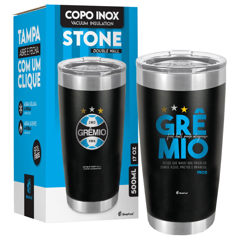 COPO TÉRMICO STONE - GRÊMIO 1 foi pensado para você! Resistente, durável e atemporal, ele possui parede dupla, isolamento a vácuo, válvula de pressão, detalhes em aço escovado e tampa que abre e fecha com um clique.
