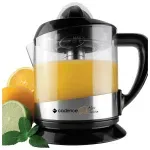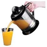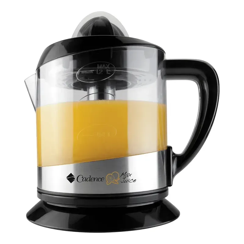 A jarra tem marcação de nível e capacidade para até 5 copos de suco ou 1,2 litros. Tem duas peneiras ajustáveis, que separam as sementes do suco e permitem o controle da quantidade de fibras da fruta a ser adicionada ao suco. Tem tampa e pode ser retirada da base, podendo ser levado direto à mesa. Design diferenciado, com fino acabamento em inox.