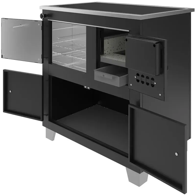 - Produto 4 em 1, pés altos para facilitar a limpeza, suporte para lenhas grandes.