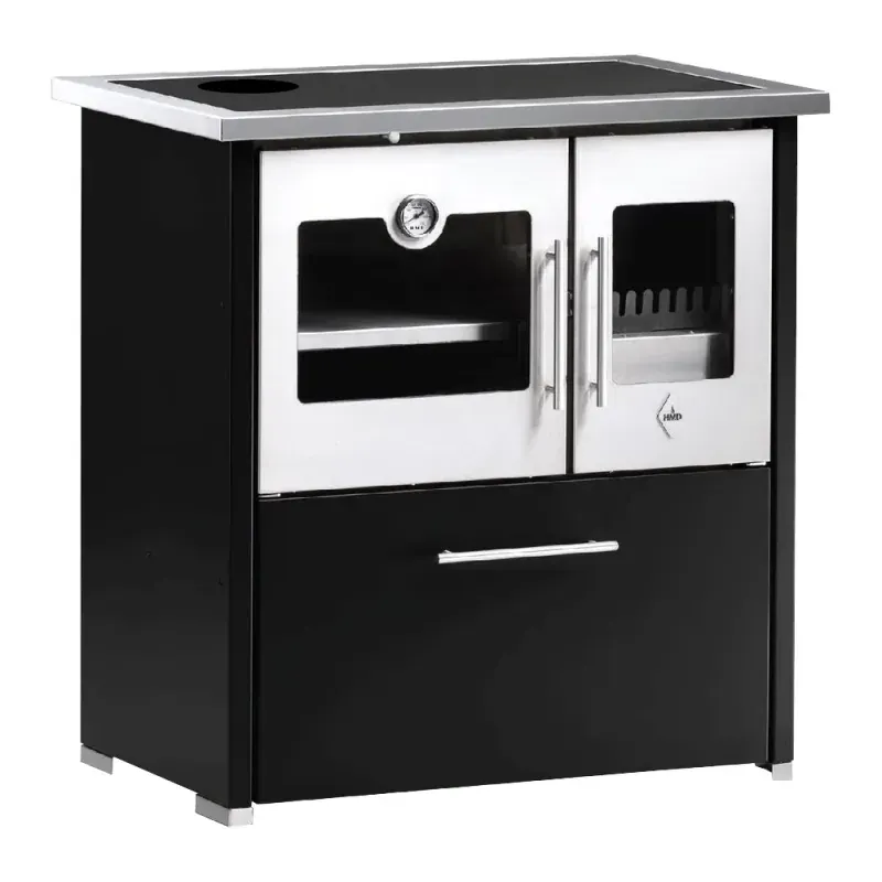 Conteúdo da Embalagem | 1 Fogão a Lenha HMD Trento Preto, com Chapa Vitrocerâmica e com Furo na Chapa - Chaminé Saída Lado Esquerdo |