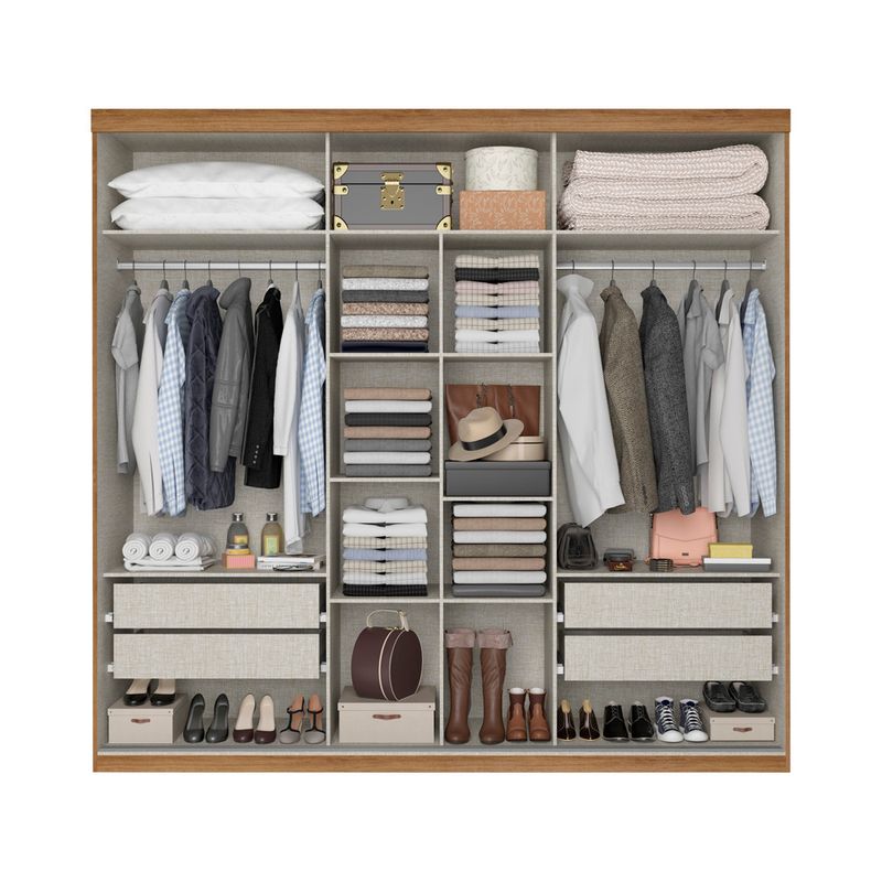 Este guarda-roupa possui 3 portas deslizantes, sendo que uma delas é revestida em vidro reflexivo (Glass), um diferencial que agrega sofisticação e amplitude visual ao ambiente. As portas deslizantes economizam espaço e permitem um acesso fácil e prático ao interior do roupeiro. Internamente, o roupeiro é equipado com 4 gavetas espaçosas, perfeitas para organizar roupas, acessórios e outros itens pessoais. Além das gavetas, o espaço interno é bem distribuído com prateleiras e cabideiros, oferecendo amplo espaço para acomodar roupas, calçados e objetos de forma organizada.