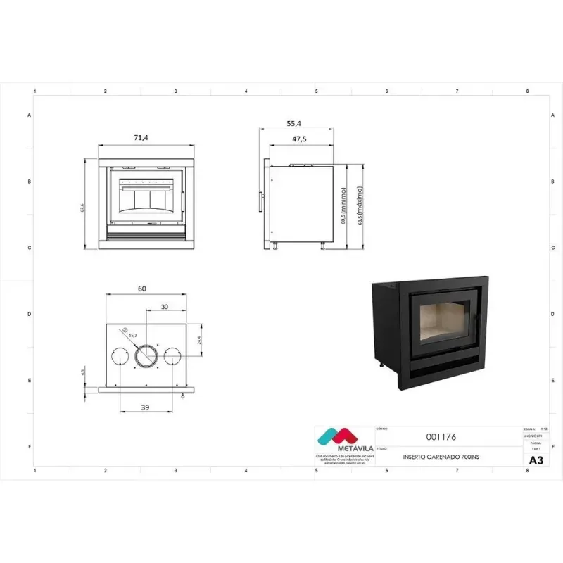 Área de aquecimento | 115,55m² (Levando em consideração um pé direito padrão de 2,7m o Inserto de Dupla Combustão Santiago 700INS aquece ambientes de até 115,55²) |