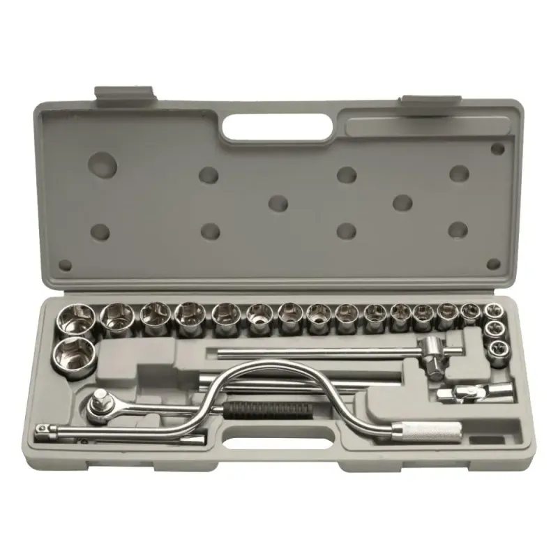 Um Jogo de Soquetes Sextavados Eda completo com 24 Peças e Encaixe 1/2", ideal para soltar e apertar parafusos, garantindo organização e praticidade em qualquer tarefa.