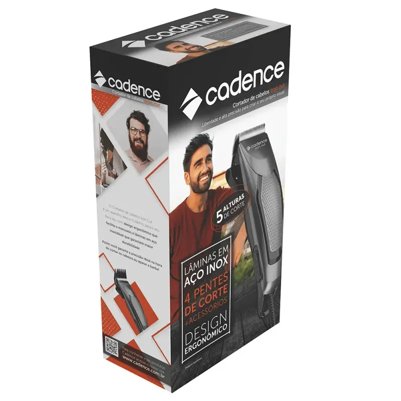 Encontre seu estilo com a Máquina de Cortar Cabelos Iron Cut Cadence, com alavanca de regulagem de altura e 4 pentes de corte, possibilitando vários tipos de cortes. Apara ou corta cabelo e barba com precisão e suavidade, sem puxar os fios ou causar desconforto. Novo design Cadence, prático, fácil de usar, leve e ergonômico. Com lâminas em aço inox que duram mais tempo e proporcionam precisão de corte.