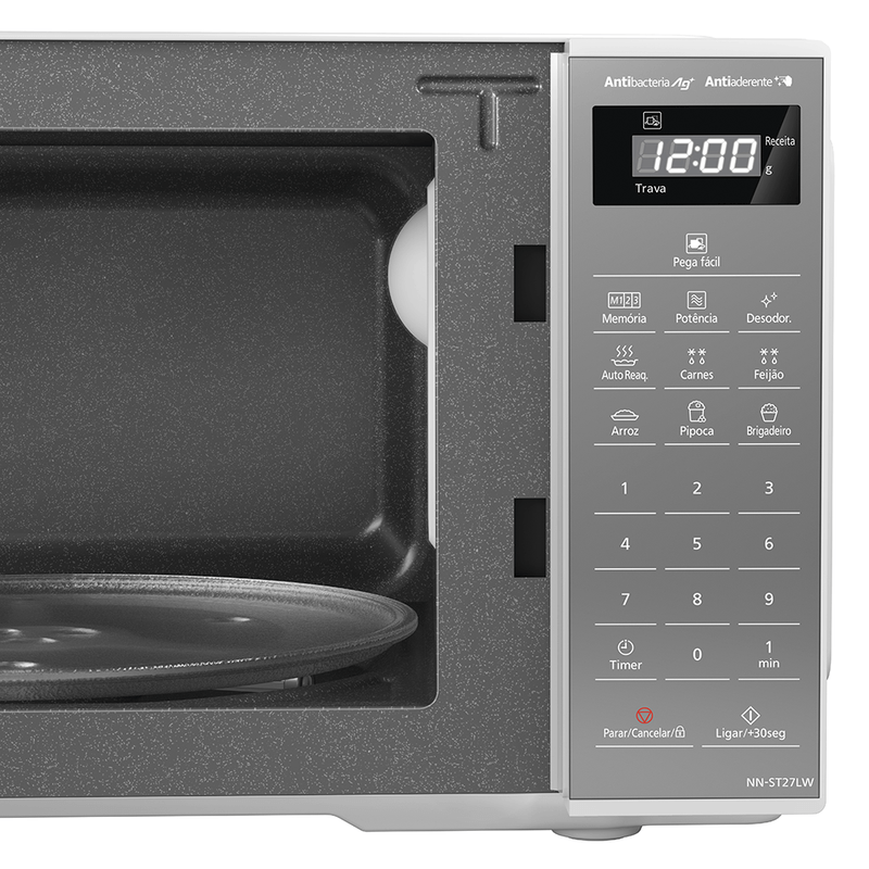 Experimente a combinação perfeita de tecnologia e conveniência com o Micro-ondas Panasonic ST27L. Projetado para o dia a dia, este aparelho de 21 litros redefine a experiência na cozinha, unindo a inovadora tecnologia Antibactéria AG a um revestimento interno antiaderente que simplifica a limpeza e garante um ambiente mais saudável. Desfrute da praticidade de funções como o Desodorizador, que elimina odores indesejados, e o Pega Fácil, que posiciona seus utensílios para fácil acesso. Com 700W de potência e 10 níveis ajustáveis, ele se adapta a diferentes necessidades, desde o aquecimento rápido até o preparo de receitas pré-programadas como Arroz, Pipoca e Brigadeiro. O acabamento Branco Espelhado confere um toque especial a qualquer ambiente, enquanto a trava de segurança eletrônica oferece tranquilidade para toda a família.
