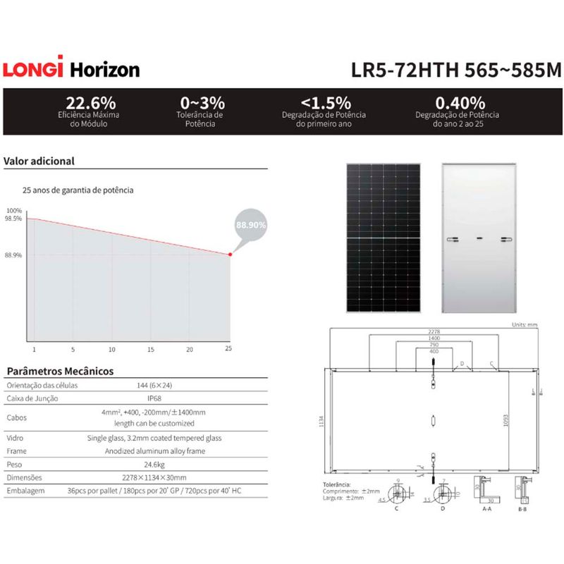 O SOLAR LONGI MONO LR5-72HTH 585W 30MM*I é um módulo fotovoltaico monocristalino de alta potência, desenvolvido com foco em eficiência energética e confiabilidade a longo prazo. Integrante da linha Horizon, este modelo é especialmente indicado para sistemas de geração distribuída em telhados comerciais, industriais e usinas solares de médio e grande porte.