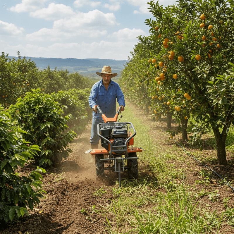 - Manutenção de pomares e viveiros, facilitando o controle de ervas daninhas e a aeração do solo entre árvores e mudas.