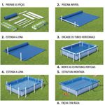PVC resistente e a estrutura é composta por tubos de aço com acabamento em pintura epóxi à pó branca, que protege contra a ferrugem e prolonga a vida útil do produto. Possui peças plásticas de acabamento com sistema de encaixe que facilita a montagem e garante estabilidade. Além disso, conta com válvula de deságue para facilitar a limpeza e o esvaziamento.