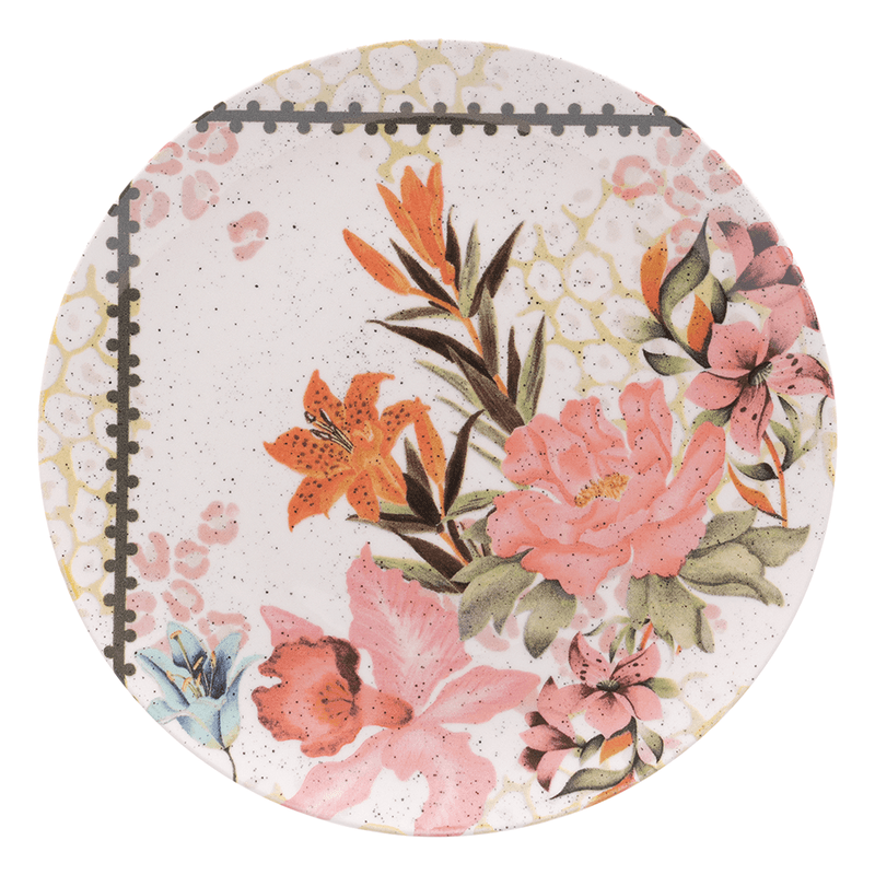 Uma coleção cheia de brasilidade. O animal print de onça já virou um clássico da estamparia e enfeita os pratos dessa coleção de uma forma discreta, mas nem por isso, com menos personalidade. O lírio tigre ganha destaque com seu tom de laranja vibrante, uma flor que culturalmente atrai prosperidade. Para completar o Buquê Tropical, orquídeas brancas e o efeito de granilha em todas as peças. O prato raso é vendido individualmente nesta opção.