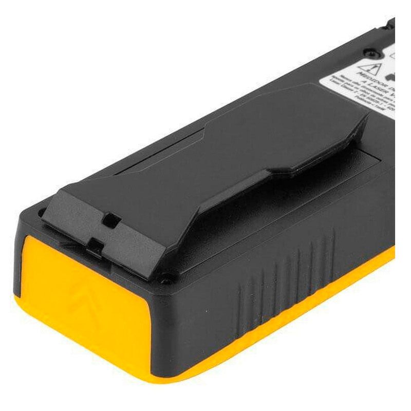 Indicado para ambientes internos e externos. Realiza medições de distância, contínua (trena eletrônica), área, volume, indireta (Pitágoras simples e Pitágoras com adição), medição de máximo e mínimo, adição e subtração. Permite a realização de medições em 5 unidades diferentes. Conta com função memória das últimas 10 medições. Duração aproximada das pilhas alcalinas: 5.000 medições. Desligamento automático do laser em aproximadamente 30 segundos e do aparelho em 180 segundos.